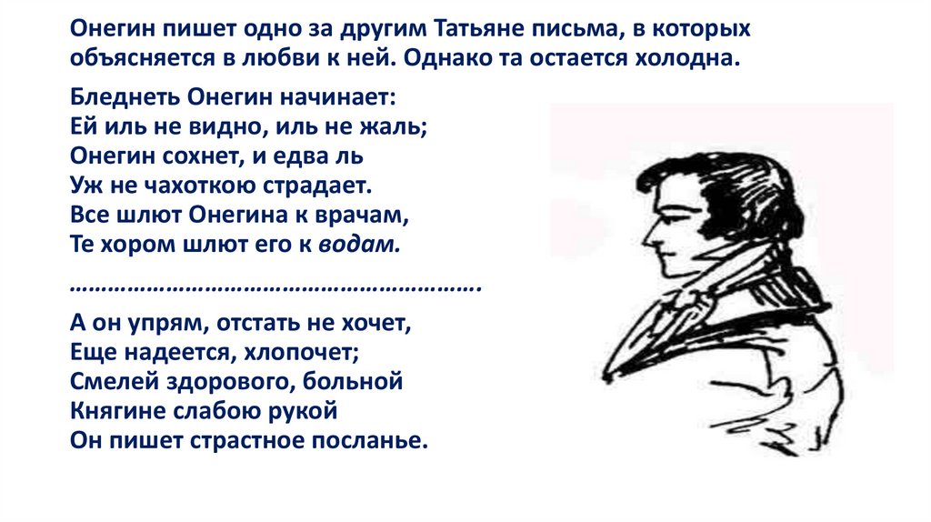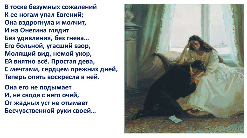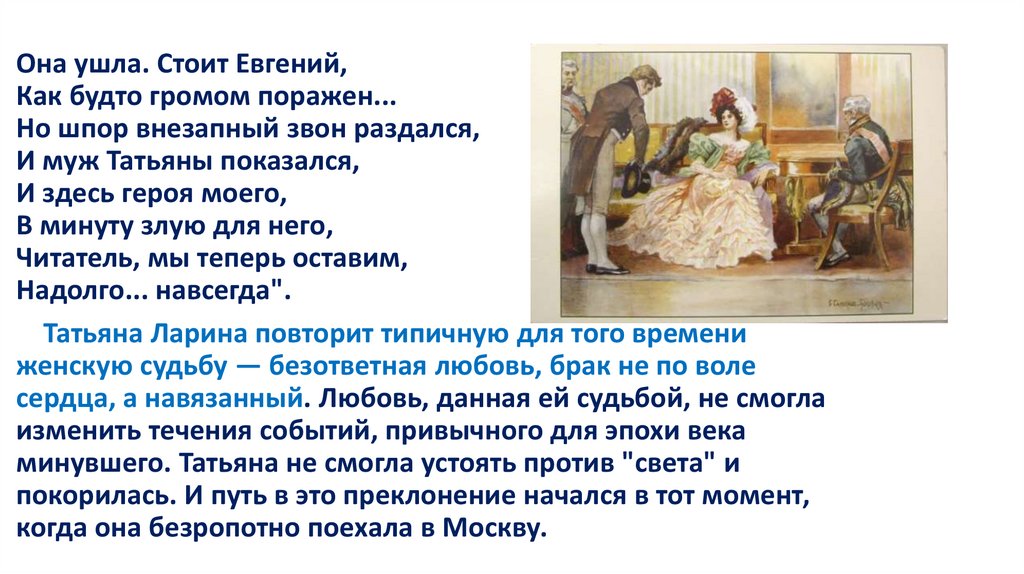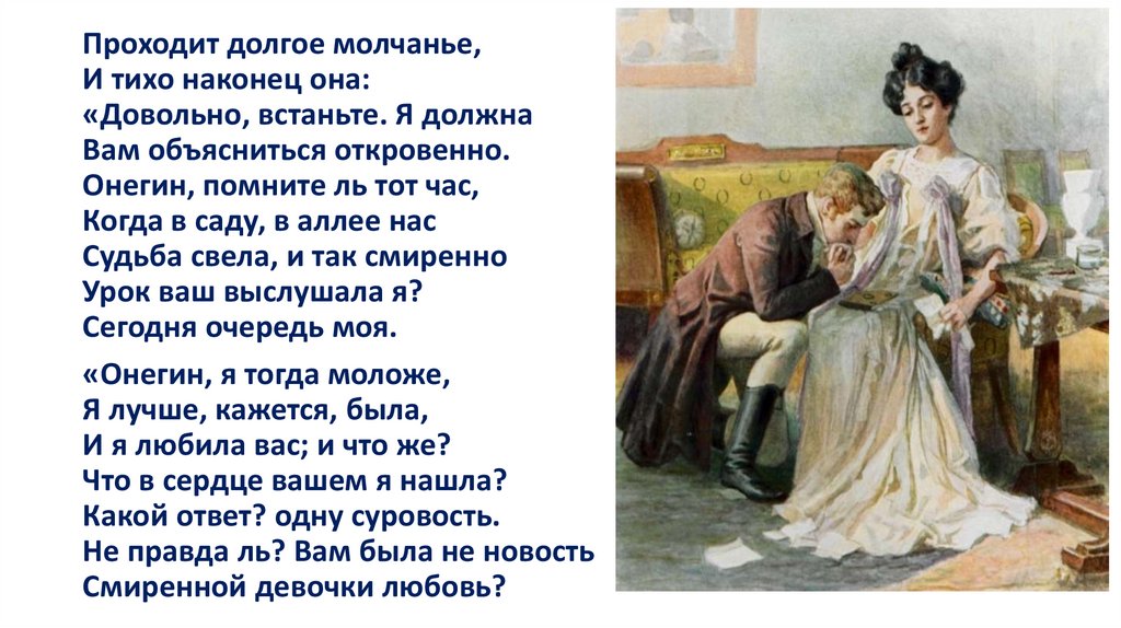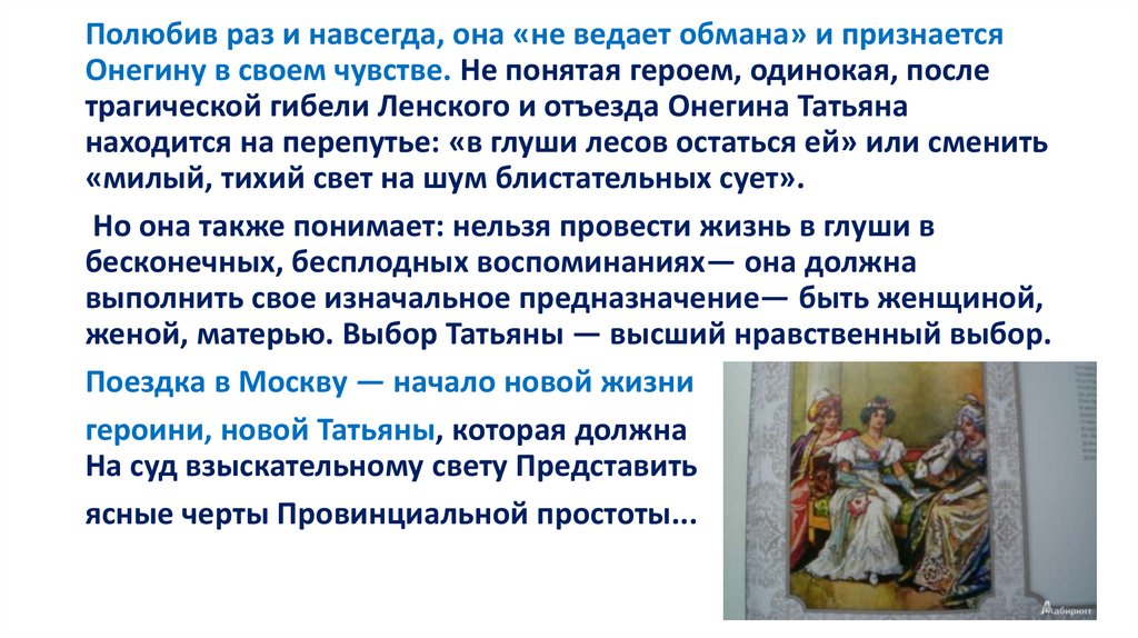 Полюбив раз и навсегда, она «не ведает обмана» и признаетсяОнегину в своем чувстве. Не понятая героем, одинокая, после