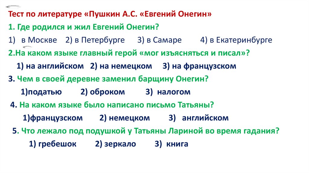 Тест по литературе «Пушкин А.С. «Евгений Онегин»1. Где родился и жил Евгений Онегин?