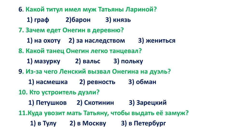 6. Какой титул имел муж Татьяны Лариной?1) граф