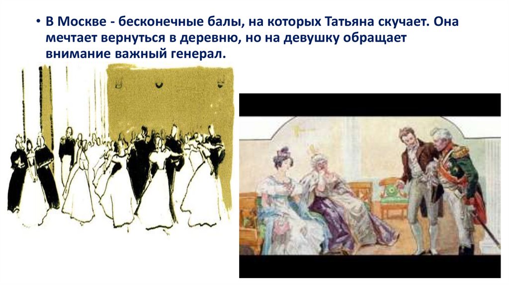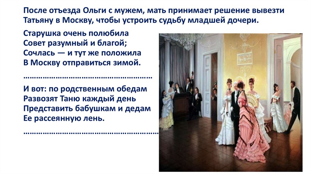 После отъезда Ольги с мужем, мать принимает решение вывезтиТатьяну в Москву, чтобы устроить судьбу младшей дочери.
