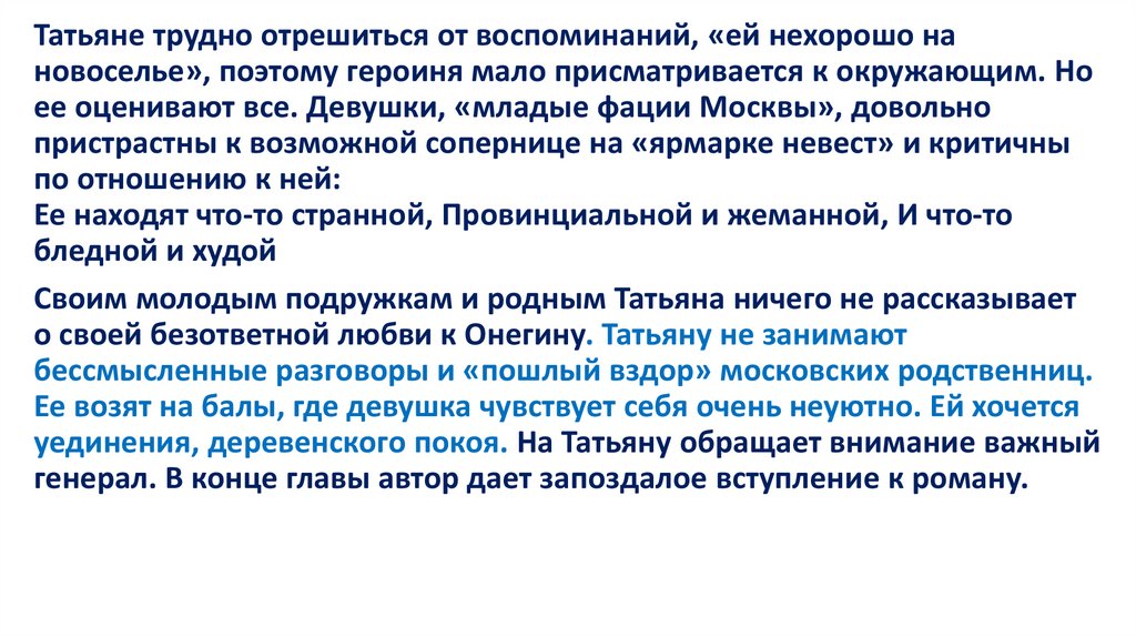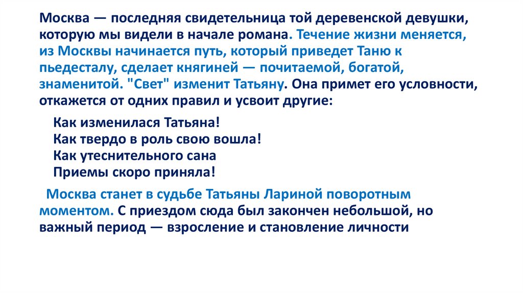 Татьяна выросла духовно, это уже не замкнутая в своемдостаточно ограниченном мире девушка-подросток, перед нами