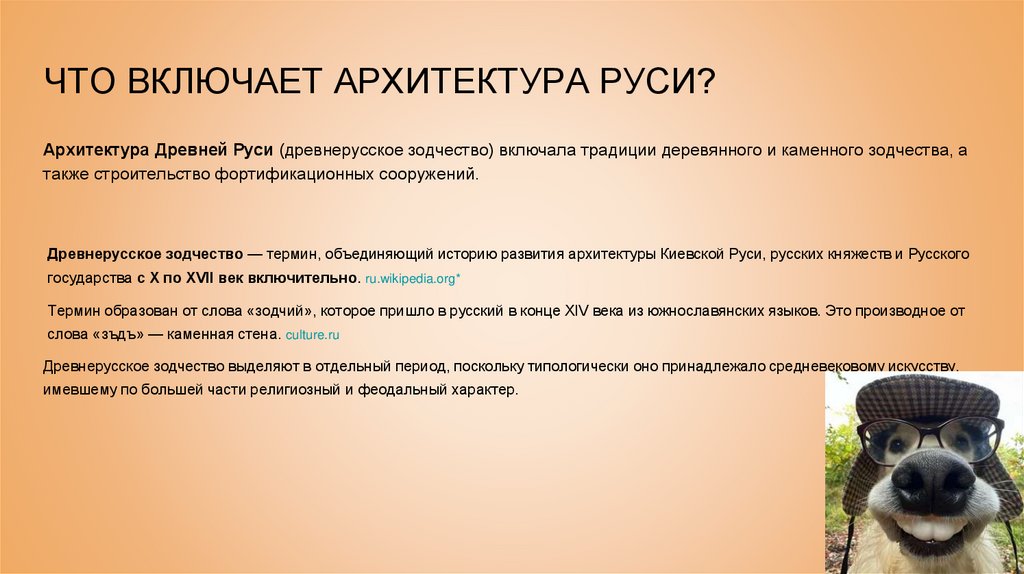 ЧТО ВКЛЮЧАЕТ АРХИТЕКТУРА РУСИ?Архитектура Древней Руси (древнерусское зодчество) включала традиции деревянного и каменного зодчества, а