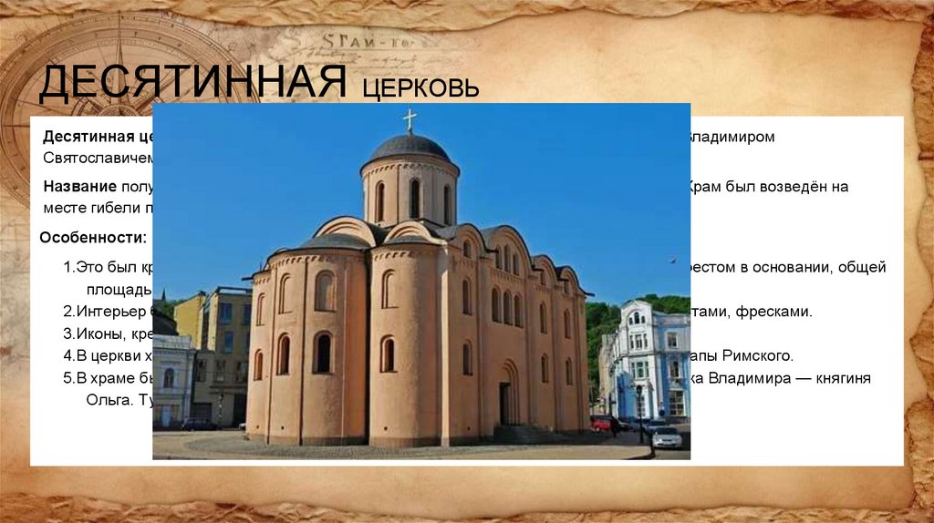 ДЕСЯТИННАЯ ЦЕРКОВЬДесятинная церковь — первый каменный православный храм на Руси, воздвигнутый Владимиром