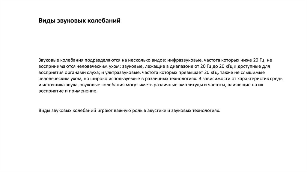 Виды звуковых колебанийЗвуковые колебания подразделяются на несколько видов: инфразвуковые, частота которых ниже 20 Гц, не