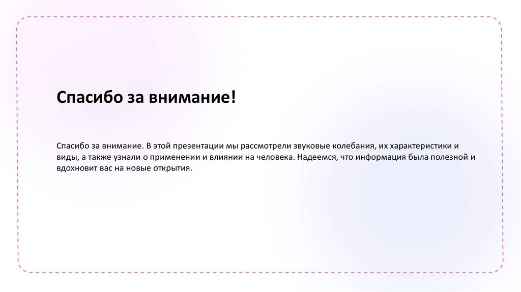 Спасибо за внимание!Спасибо за внимание. В этой презентации мы рассмотрели звуковые колебания, их характеристики и
