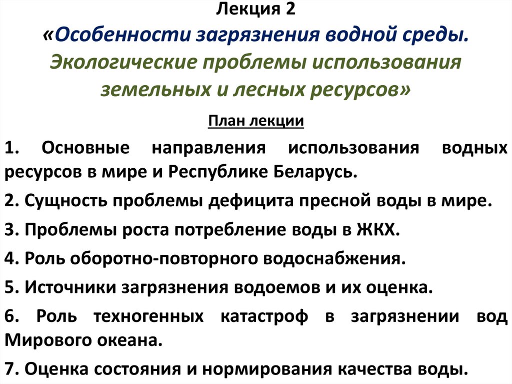 1. Лекция 2 «Особенности загрязнения водной среды. Экологические проблемы использования земельных и лесных ресурсов»
