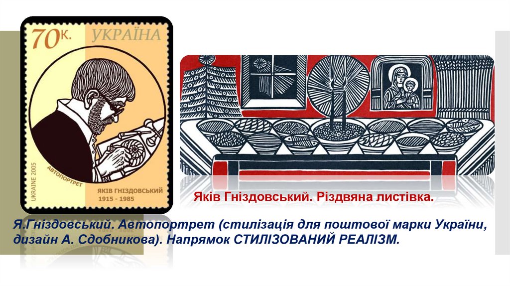 Яків Гніздовський. Різдвяна листівка.Я.Гніздовський. Автопортрет (стилізація для поштової марки України,