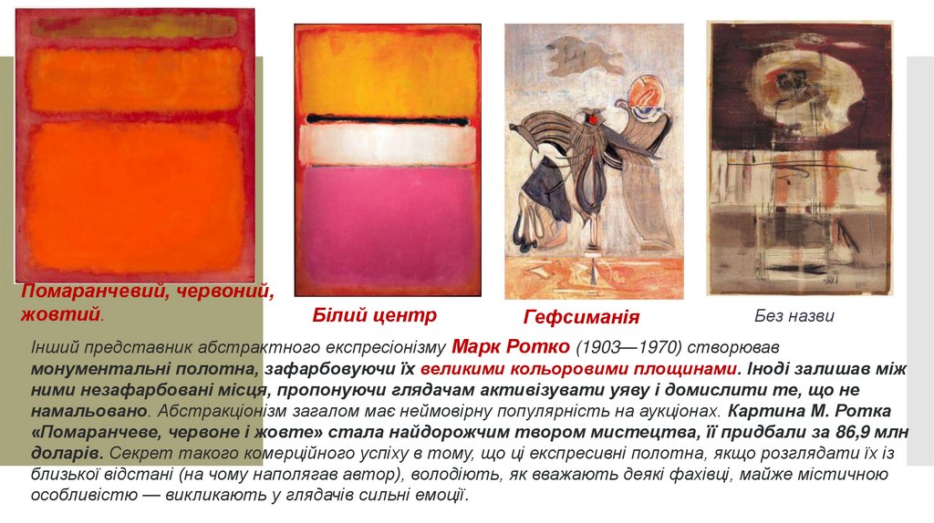Інший представник абстрактного експресіонізму Марк Ротко (1903—1970) створював