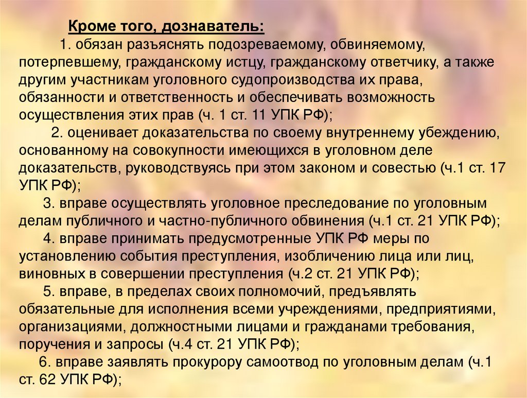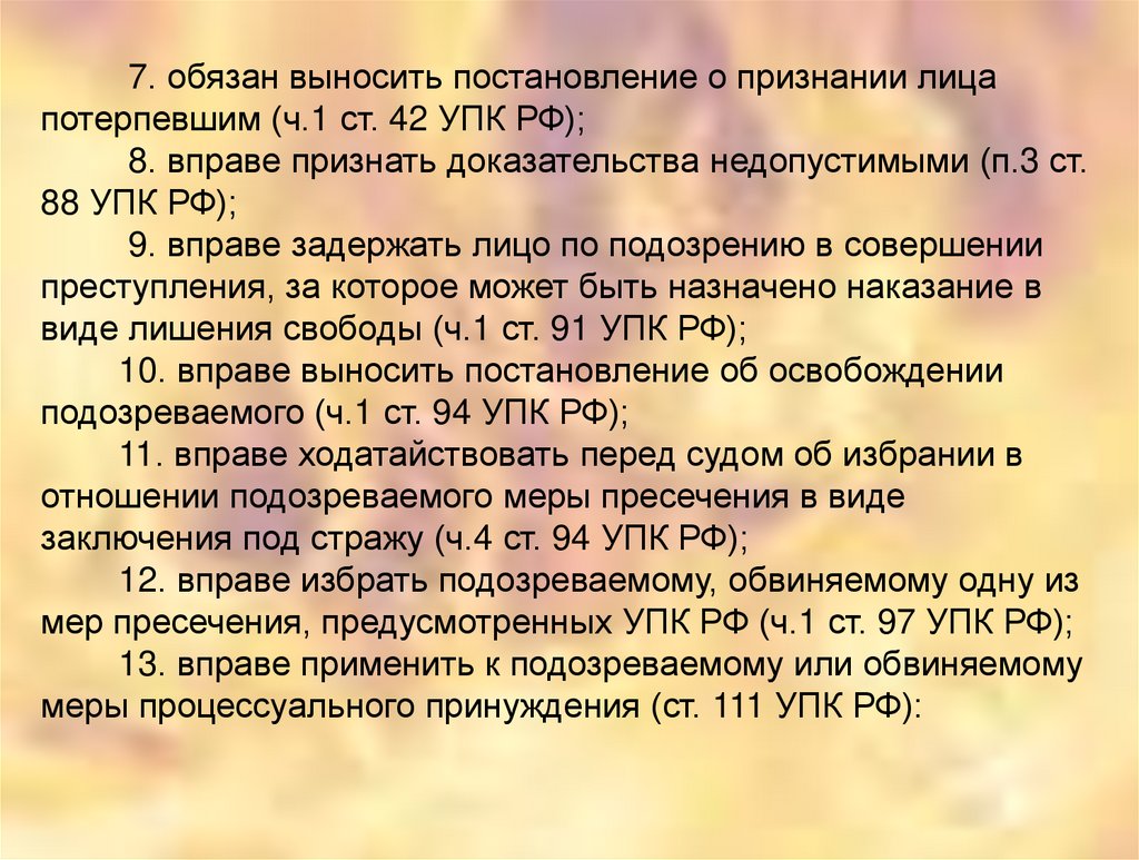 7. обязан выносить постановление о признании лицапотерпевшим (ч.1 ст. 42 УПК РФ);