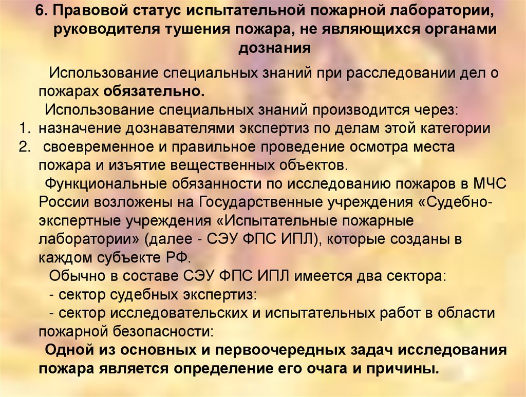 6. Правовой статус испытательной пожарной лаборатории,руководителя тушения пожара, не являющихся органами