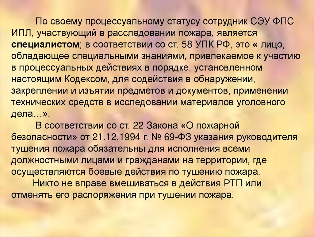 По своему процессуальному статусу сотрудник СЭУ ФПСИПЛ, участвующий в расследовании пожара, является