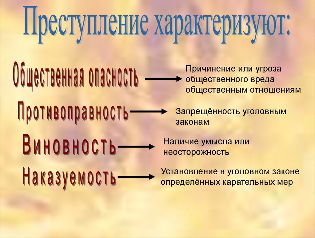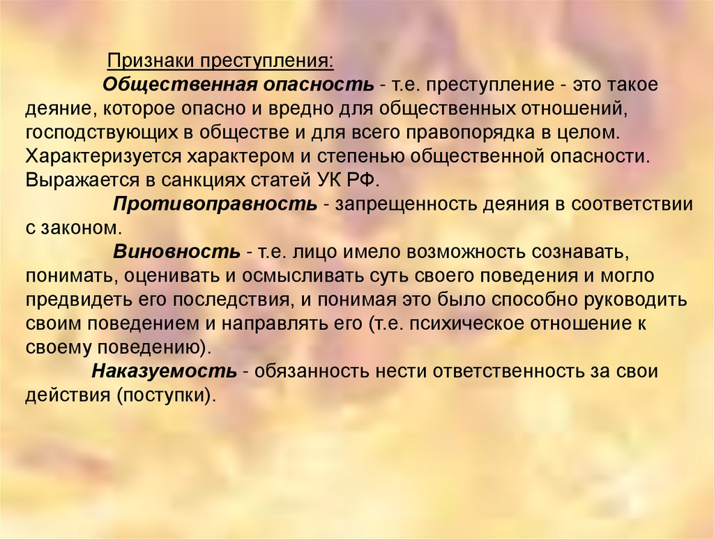 Признаки преступления:Общественная опасность - т.е. преступление - это такое
