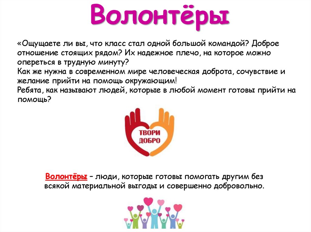 Волонтёры«Ощущаете ли вы, что класс стал одной большой командой? Доброе