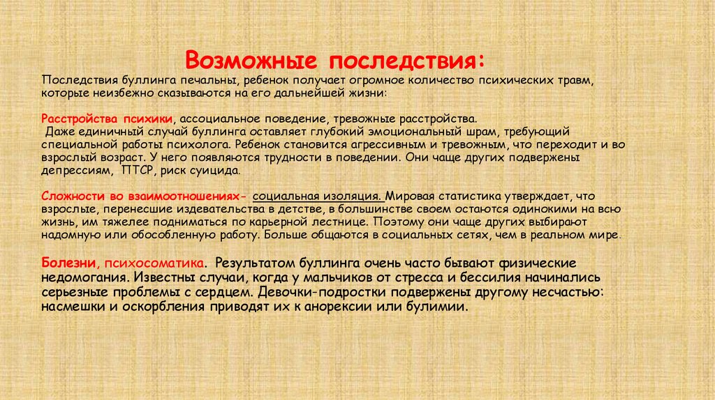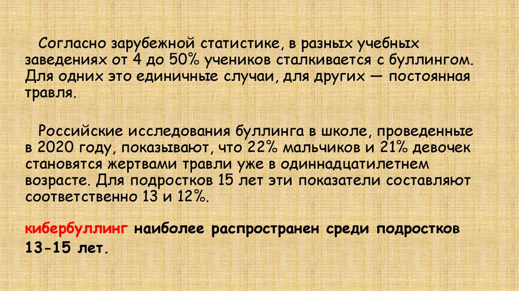 Согласно зарубежной статистике, в разных учебныхзаведениях от 4 до 50% учеников сталкивается с буллингом.