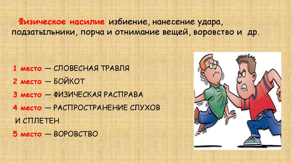 Физическое насилие избиение, нанесение удара,подзатыльники, порча и отнимание вещей, воровство и др.