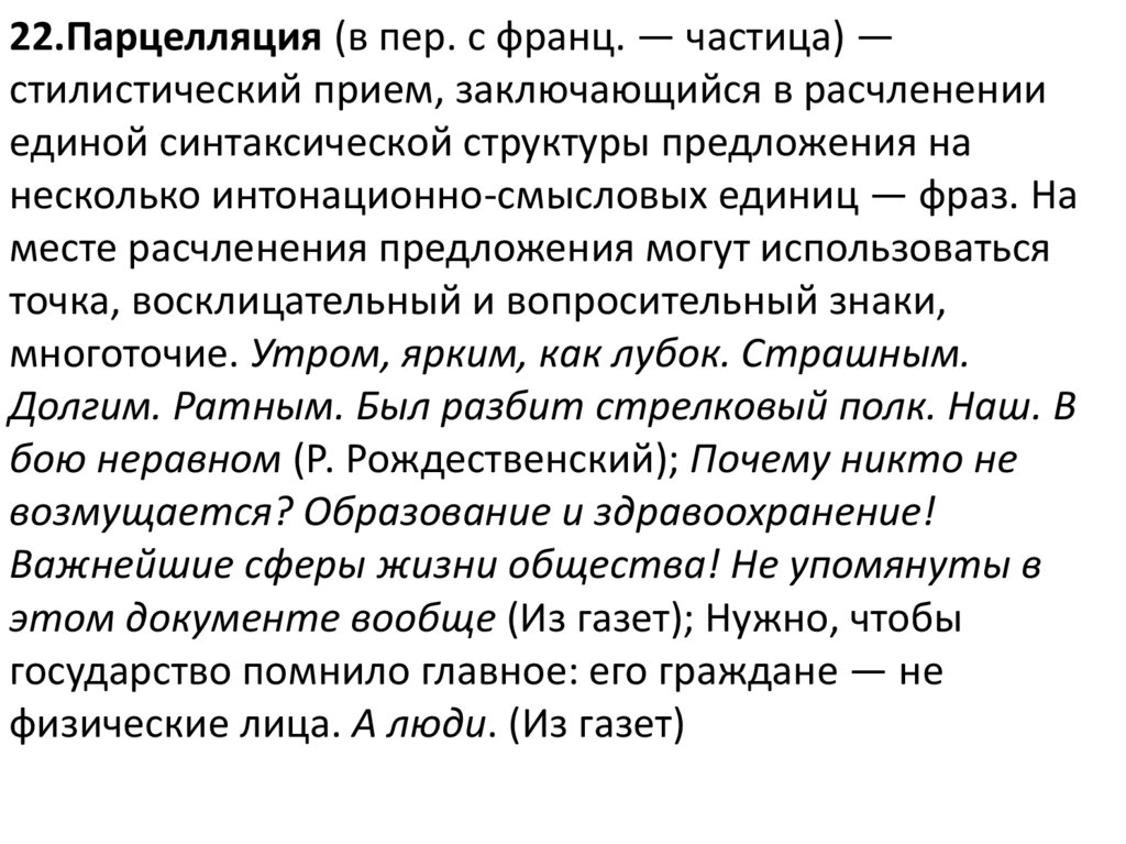 22.Парцелляция (в пер. с франц. — частица) —стилистический прием, заключающийся в расчленении