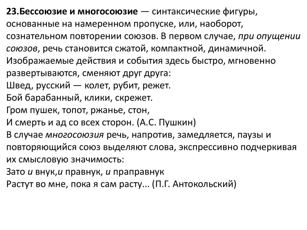 23.Бессоюзие и многосоюзие — синтаксические фигуры,основанные на намеренном пропуске, или, наоборот,