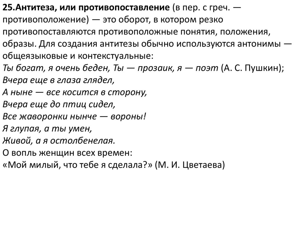 25.Антитеза, или противопоставление (в пер. с греч. —противоположение) — это оборот, в котором резко