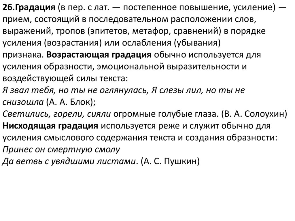 26.Градация (в пер. с лат. — постепенное повышение, усиление) —прием, состоящий в последовательном расположении слов,