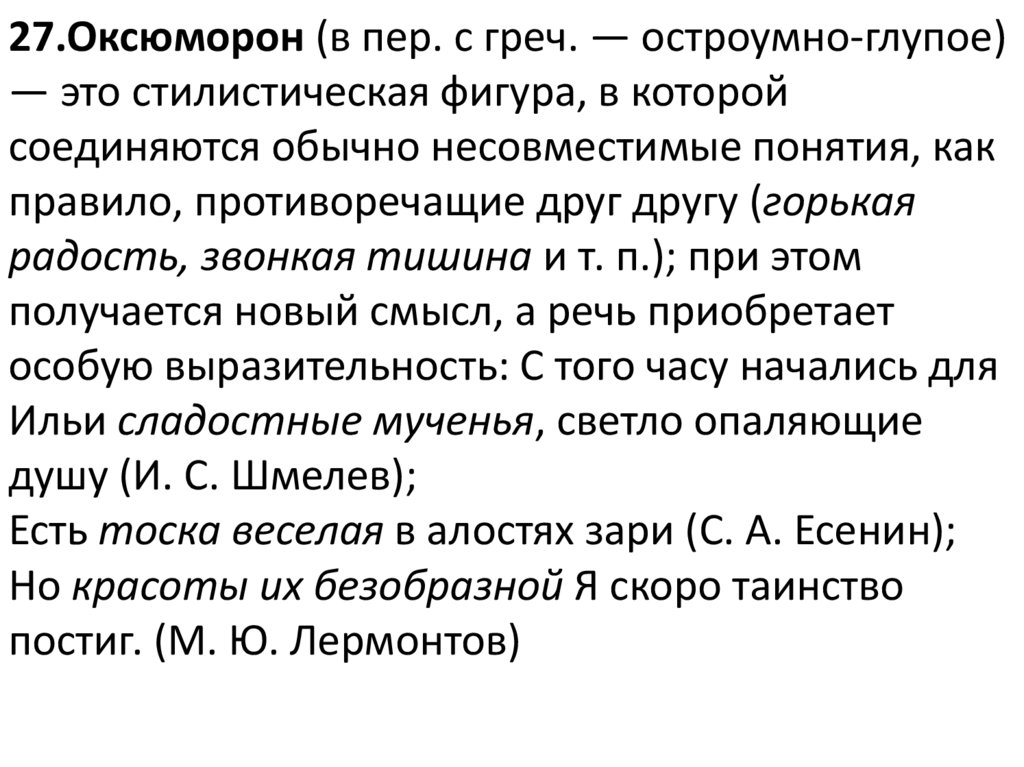27.Оксюморон (в пер. с греч. — остроумно-глупое)— это стилистическая фигура, в которой