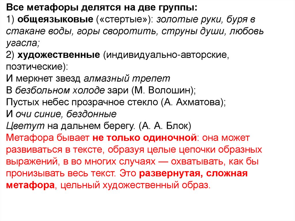 Все метафоры делятся на две группы:1) общеязыковые («стертые»): золотые руки, буря в