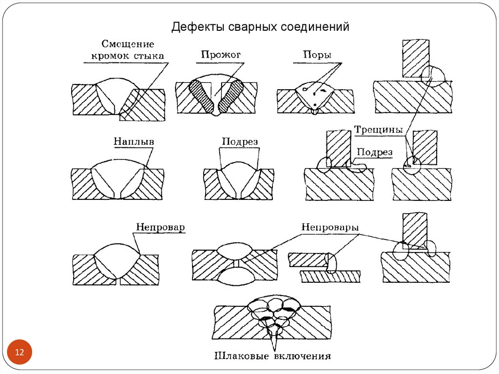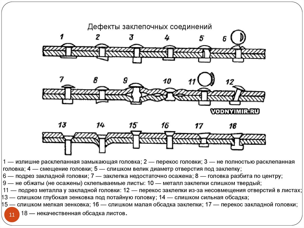 11 — подрез металла у закладной головки: 12 — перекос заклепки из-за несовмещения отверстий в листах;