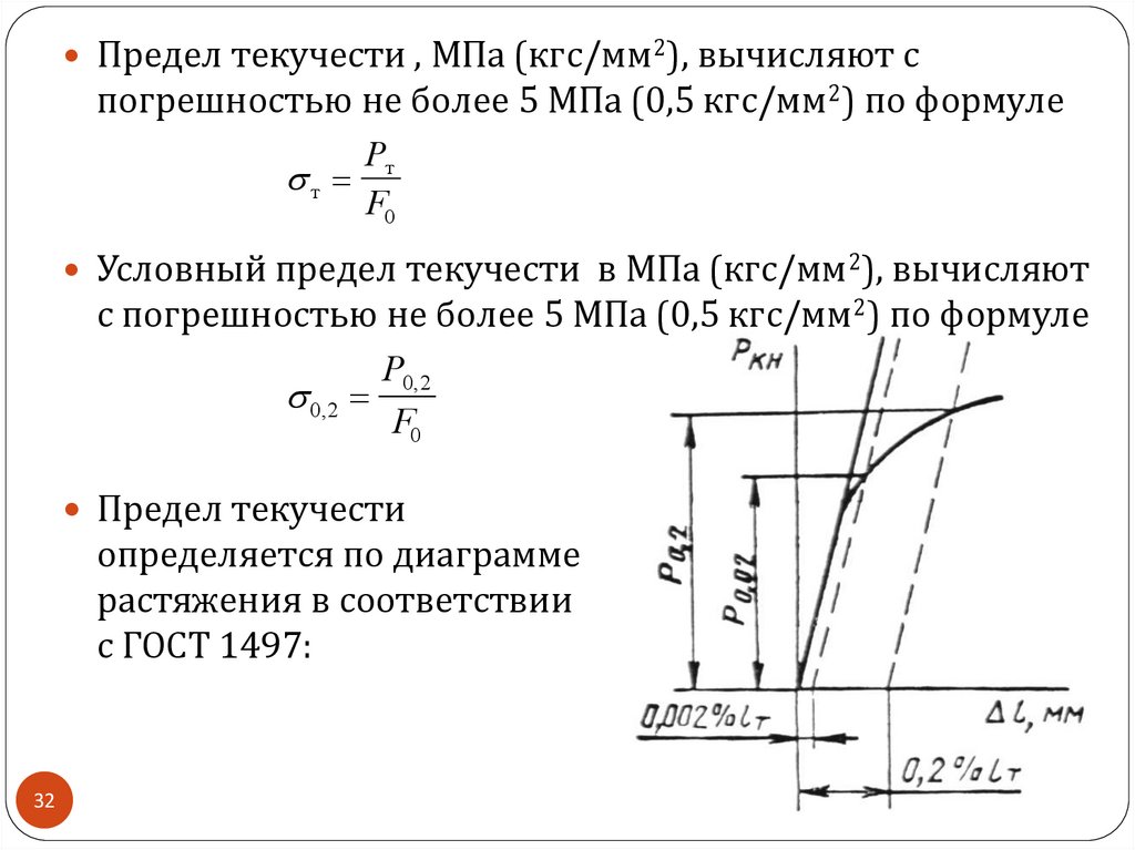Предел текучести , МПа (кгс/мм2), вычисляют спогрешностью не более 5 МПа (0,5 кгс/мм2) по формуле