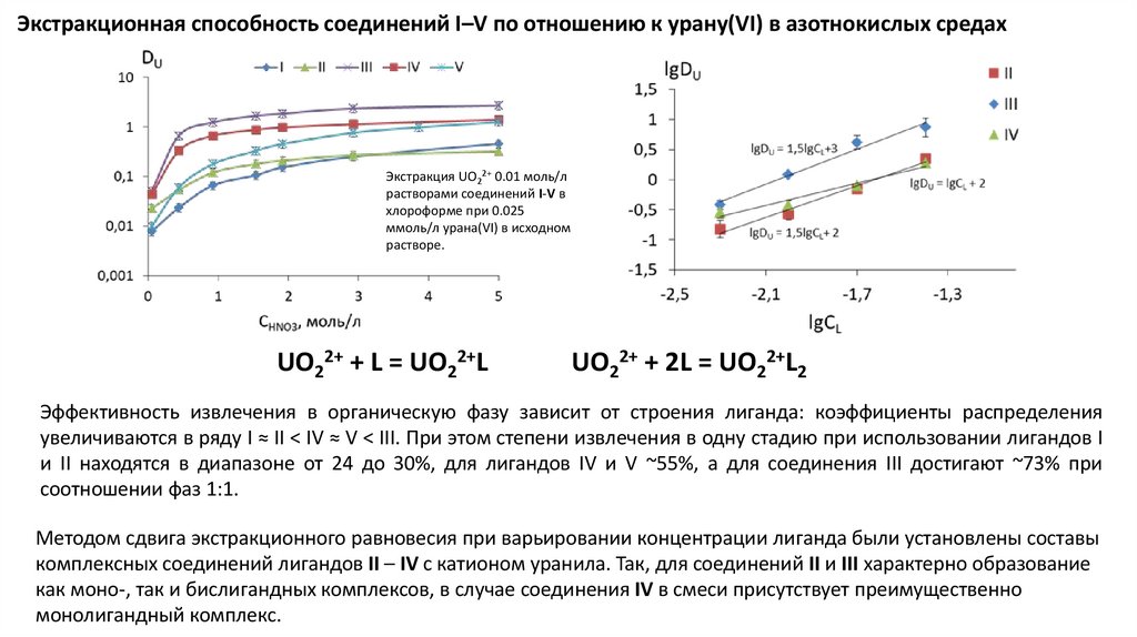 Экстракционная способность соединений I–V по отношению к урану(VI) в азотнокислых средахЭкстракция UO22+ 0.01 моль/л