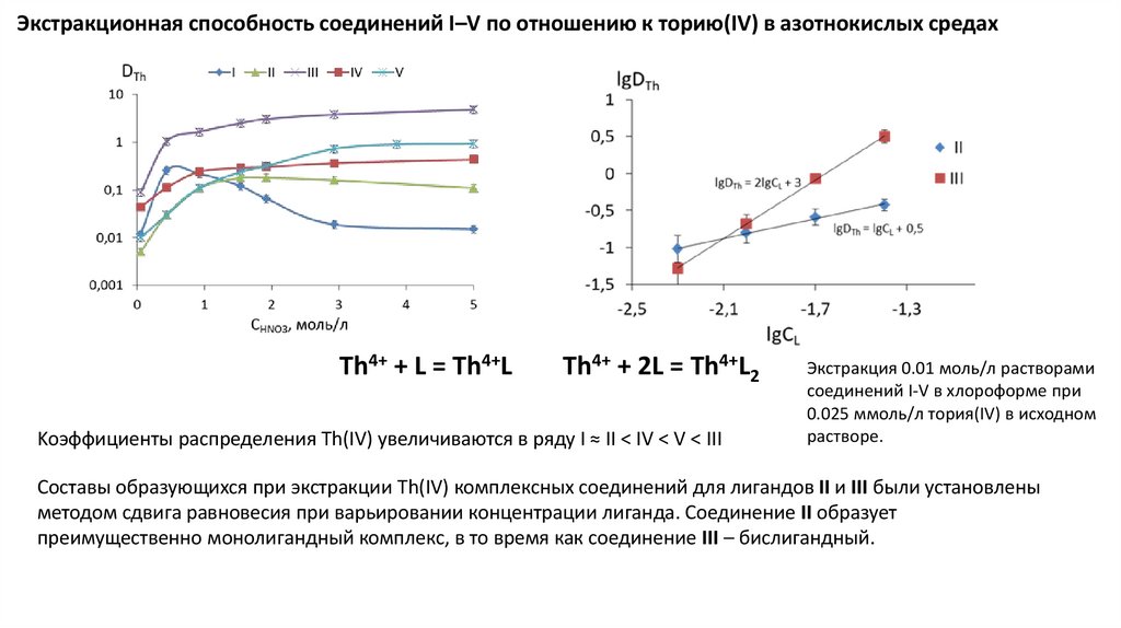 Экстракционная способность соединений I–V по отношению к торию(IV) в азотнокислых средахTh4+ + L = Th4+L