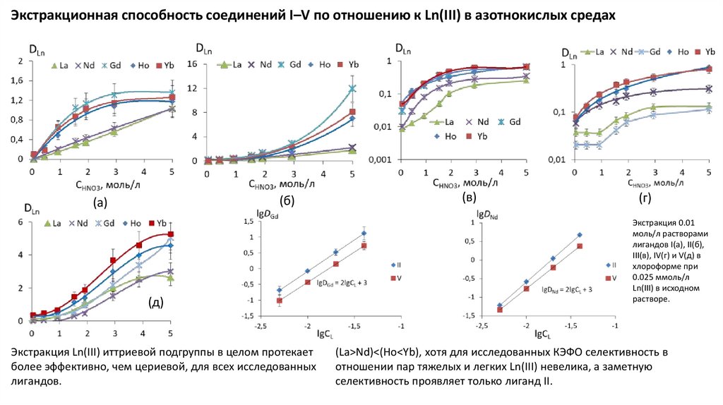 Экстракционная способность соединений I–V по отношению к Ln(III) в азотнокислых средах(б)