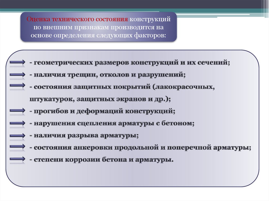 Оценка технического состояния конструкцийпо внешним признакам производится на