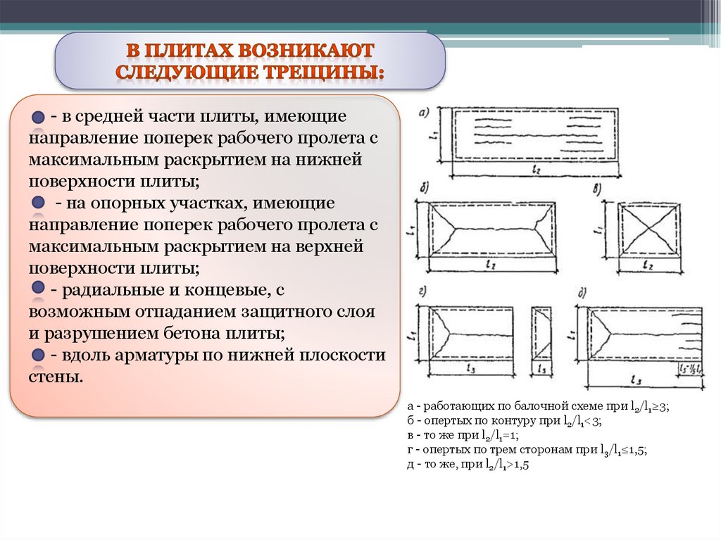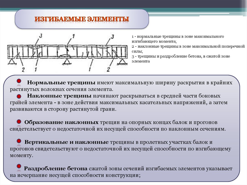 1 - нормальные трещины в зоне максимальногоизгибающего момента;