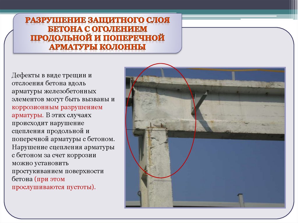 стержнями арматуры легко крошится. Пластинчатая ржавчина или язвы на стержнях оголенной рабочей арматуры в зоне продольных трещин или на закладных