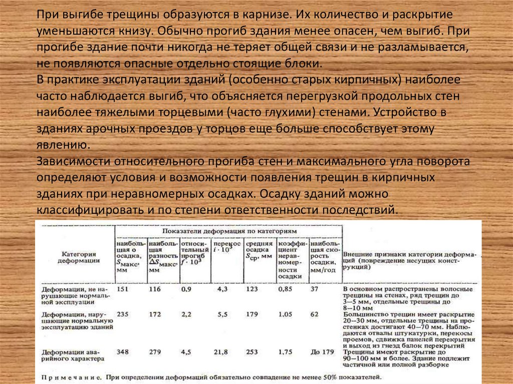 При выгибе трещины образуются в карнизе. Их количество и раскрытиеуменьшаются книзу. Обычно прогиб здания менее опасен, чем выгиб. При