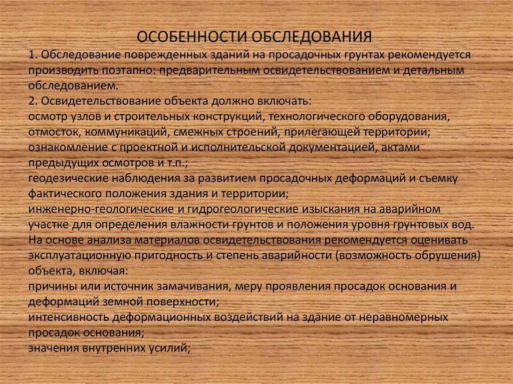 ОСОБЕННОСТИ ОБСЛЕДОВАНИЯ1. Обследование поврежденных зданий на просадочных грунтах рекомендуется