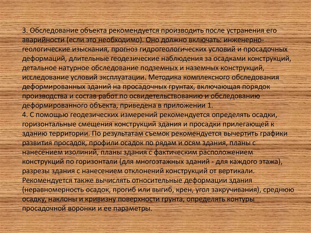 3. Обследование объекта рекомендуется производить после устранения егоаварийности (если это необходимо). Оно должно включать: инженерногеологические изыскания, прогноз гидрогеологических условий и просадочных