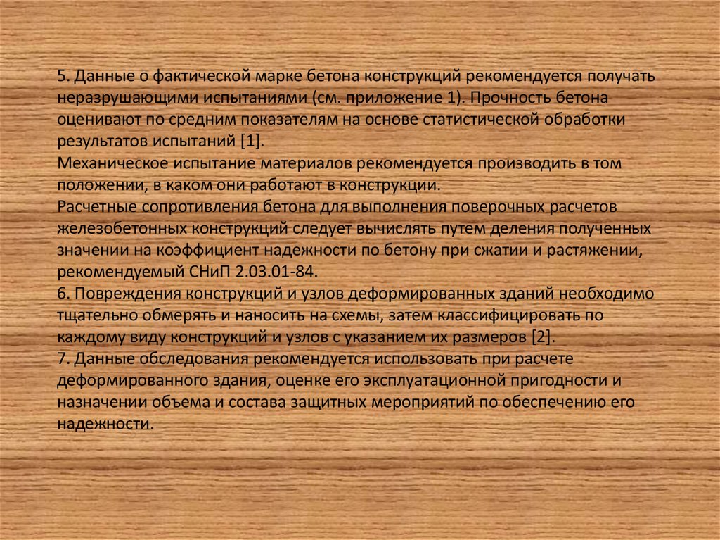 5. Данные о фактической марке бетона конструкций рекомендуется получатьнеразрушающими испытаниями (см. приложение 1). Прочность бетона