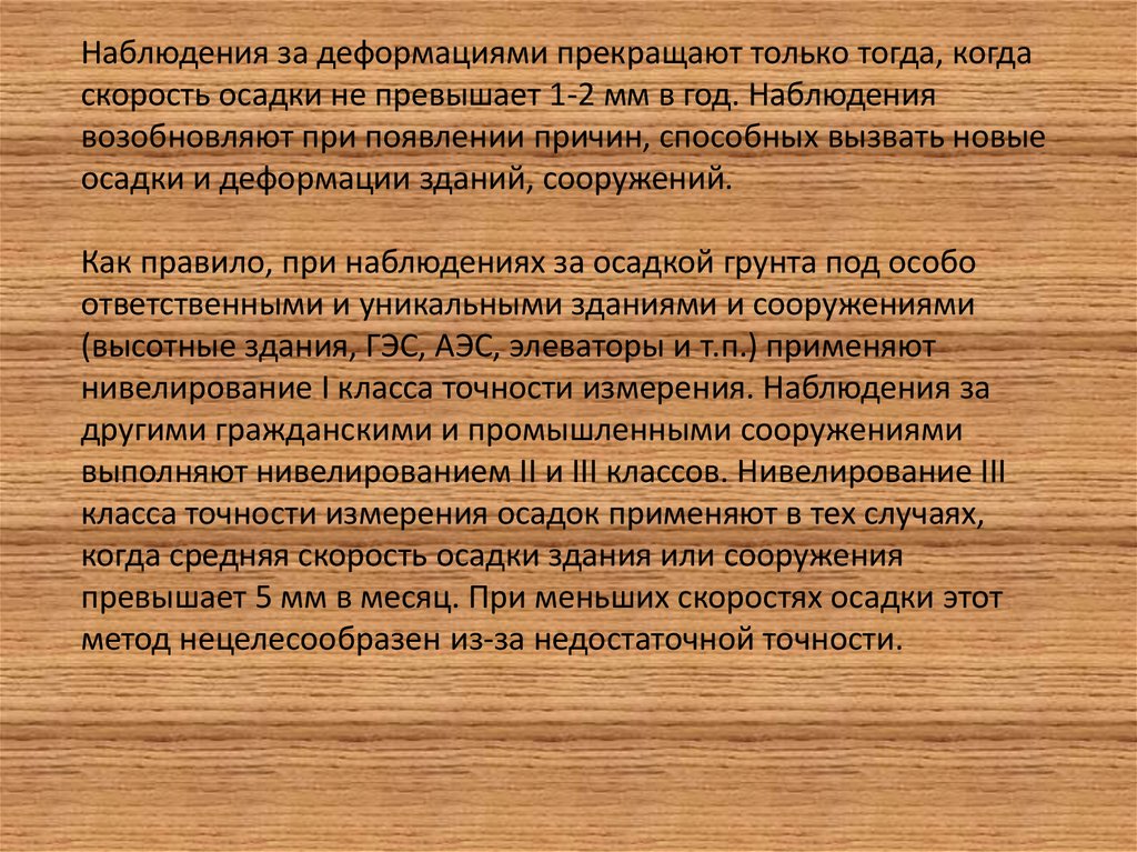 Наблюдения за деформациями прекращают только тогда, когдаскорость осадки не превышает 1-2 мм в год. Наблюдения