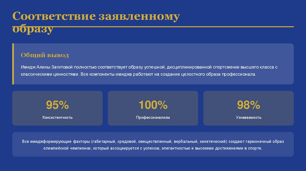 Все имиджформирующие факторы (габитарный, средовой, овеществленный, вербальный, кинетический) создают гармоничный образ