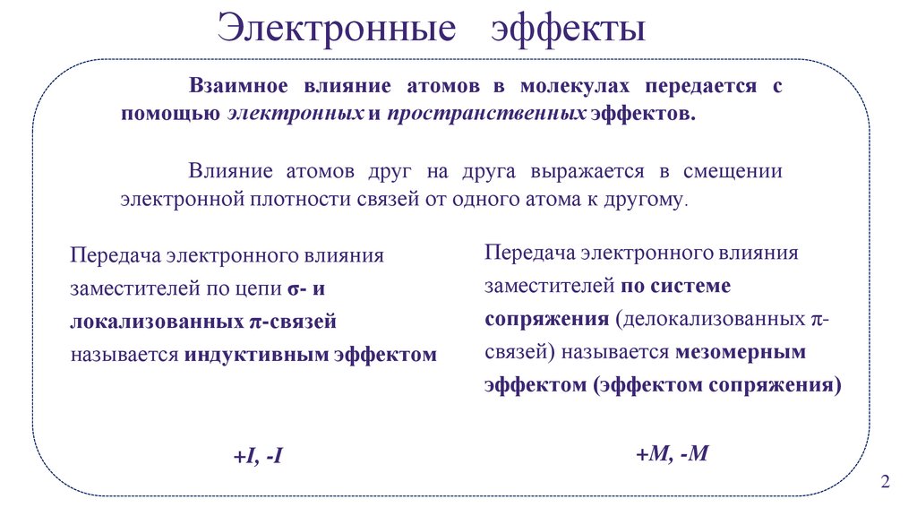 Электронные эффектыВзаимное влияние атомов в молекулах передается с