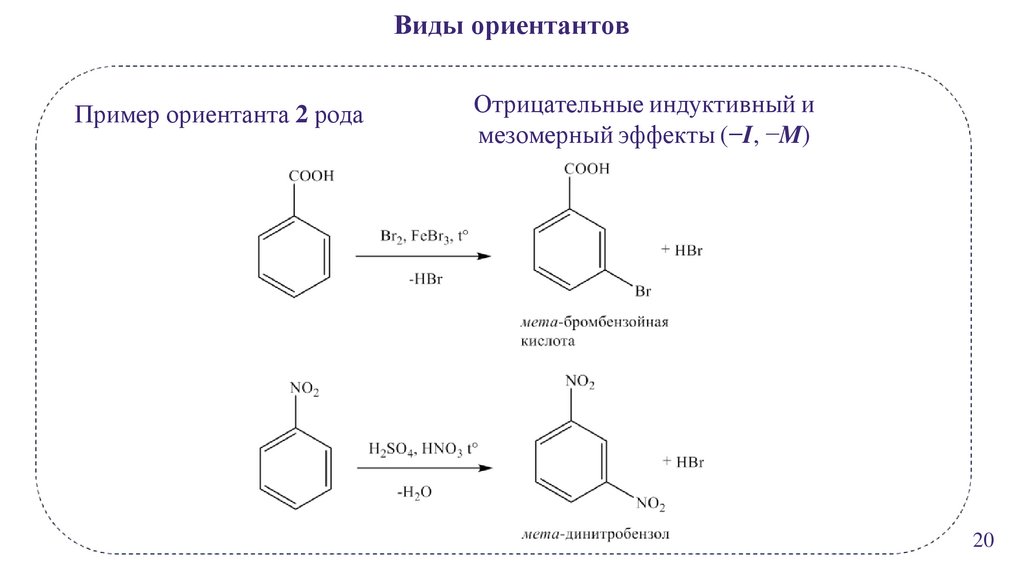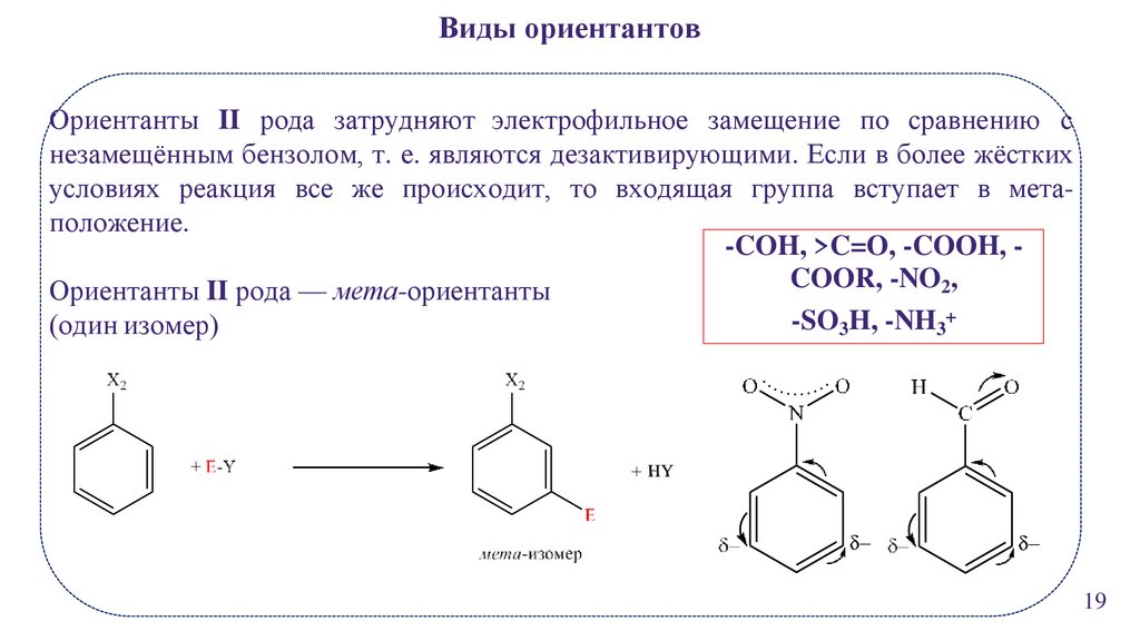 Заместители — -C=O, -COOH, -C≡N, -C6H5, -NO2, -SO3H.