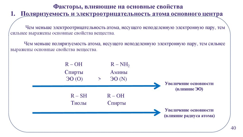 Факторы, влияющие на основные свойства1. Поляризуемость и электроотрицательность атома основного центра