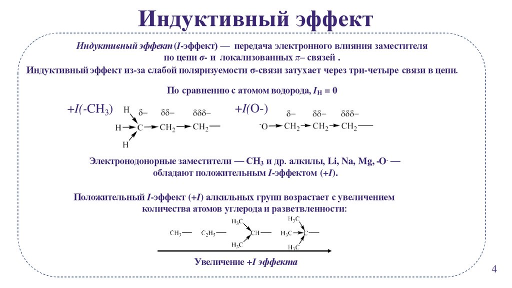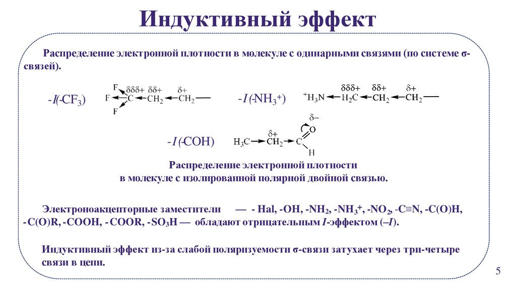 Индуктивный эффектРаспределение электронной плотности в молекуле с одинарными связями (по системе σсвязей).