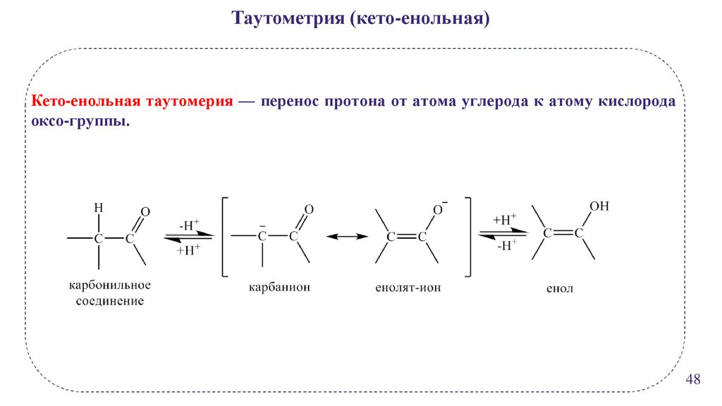Таутометрия (кето-енольная)Кето-енольная таутомерия — перенос протона от атома углерода к атому кислорода