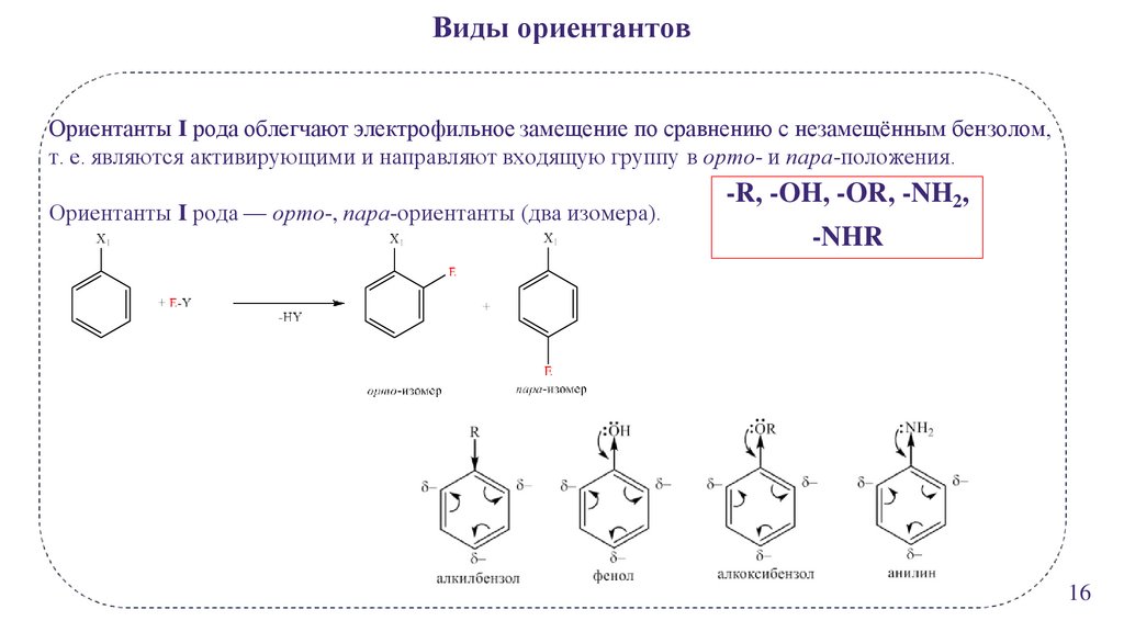 Электроноакцепторные заместители — - Hal, -OH, -NH2, -NH 3+, -NO 2, -C≡N, -C(O)H,