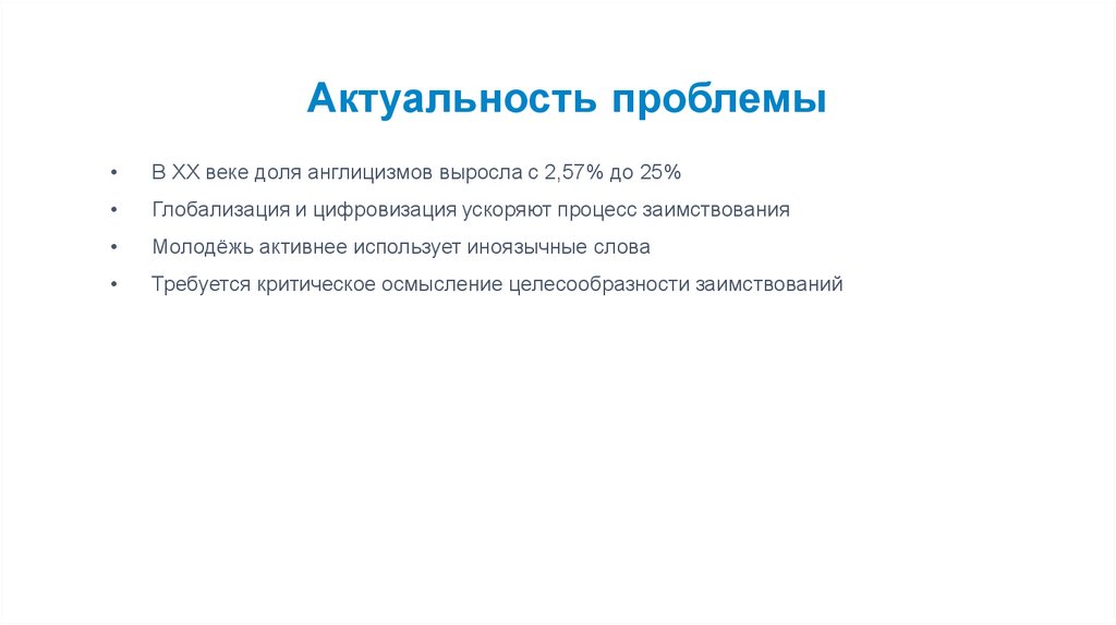 Актуальность проблемыВ XX веке доля англицизмов выросла с 2,57% до 25%