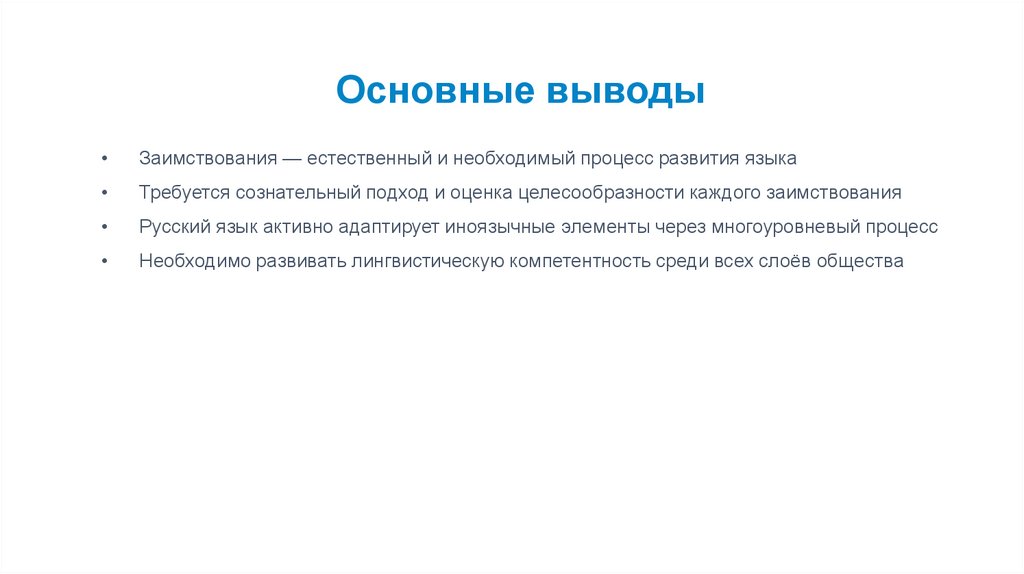 Основные выводыЗаимствования — естественный и необходимый процесс развития языка