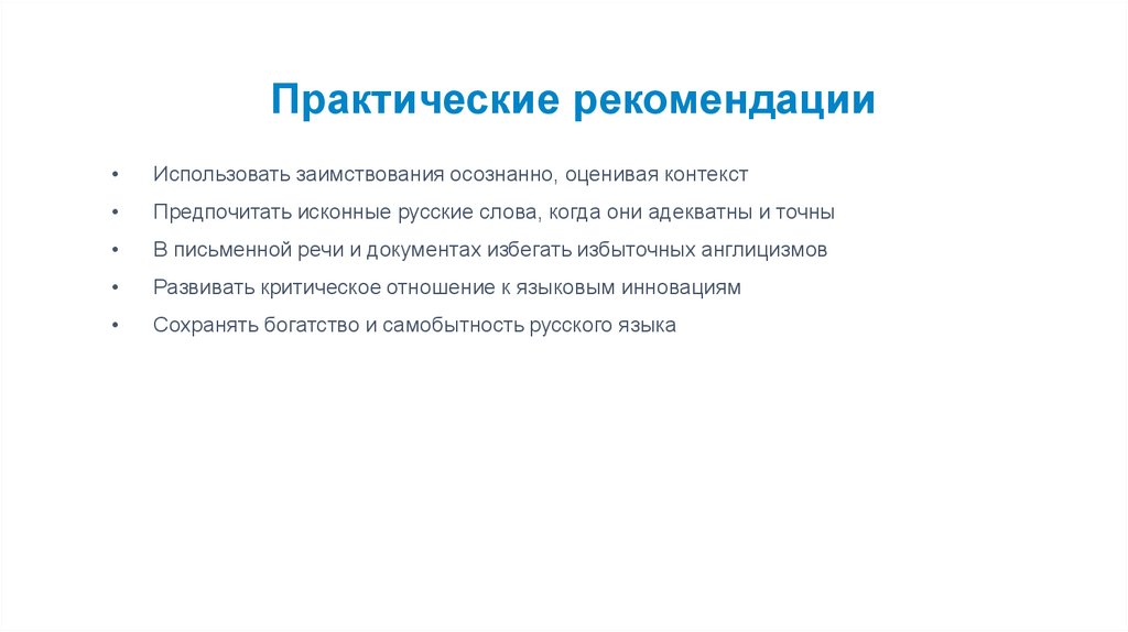 Практические рекомендацииИспользовать заимствования осознанно, оценивая контекст