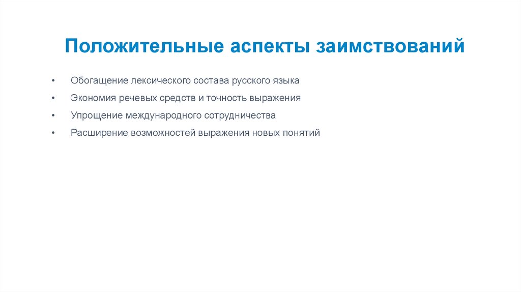 Положительные аспекты заимствованийОбогащение лексического состава русского языка