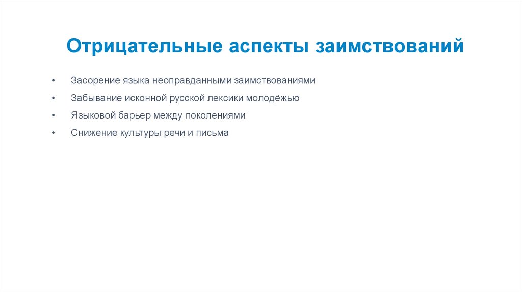 Отрицательные аспекты заимствованийЗасорение языка неоправданными заимствованиями